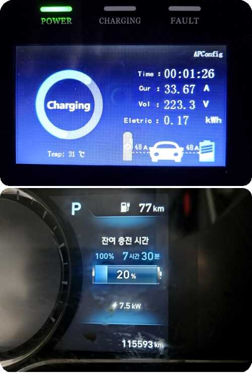 * 코나EV에 충전해보니 7.6키로(35A) 충전됩니다 (7번사진)